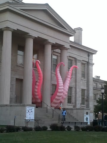 One day in November, when it was 30 degrees and I was wearing my Alabama-winter coat, I said to my friend, “I’m glad it’s finally winter.” He chuckled, with this devilish look in his eye, and said, “This isn’t winter.” A few weeks later, on a day when it was 15 degrees and we were shivering in a field, I said, “Is this winter?” After a long pause, possibly because the synapses in his brain were slowed by the chill, he said, “Yeah, this counts as winter.” But the winter is no match for the warmth of the folks who were waiting for me in Iowa City. I’ve moved a lot in the last fifteen years, and I never felt quite as welcomed as I did my first week here. New friends brought me into their homes and showed me around town, helped me find an apartment and invited me to Thanksgiving dinner. I knew I liked this town when I found good coffee shops and a great bookstore, when I bumped into someone I knew when I’d only been in town for three days, and when I walked past the old capitol and saw it had been engulfed by gigantic pink tentacles–a local artist’s installation that reminds us to embrace our surges of creativity. That’s just the kind of surge that brought me here, but the wave of kindness is what made me feel like I belong.
