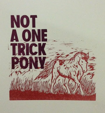 After a few days of nonstop printing, I had a pile of prints. Some I like better than others. Some were a chance to play and recycle some printing plates I’ve been wanting to use again (greyhounds, anyone?). This one uses that great wood type from the southern hemisphere and pairs it with a horse I carved a while back and was then disappointed that it really didn’t work out for a book project I was planning. It rode around in the back of my car for about 3,000 miles and then I found its purpose (this one is for all of my uber-creative friends out there who keep me inspired):