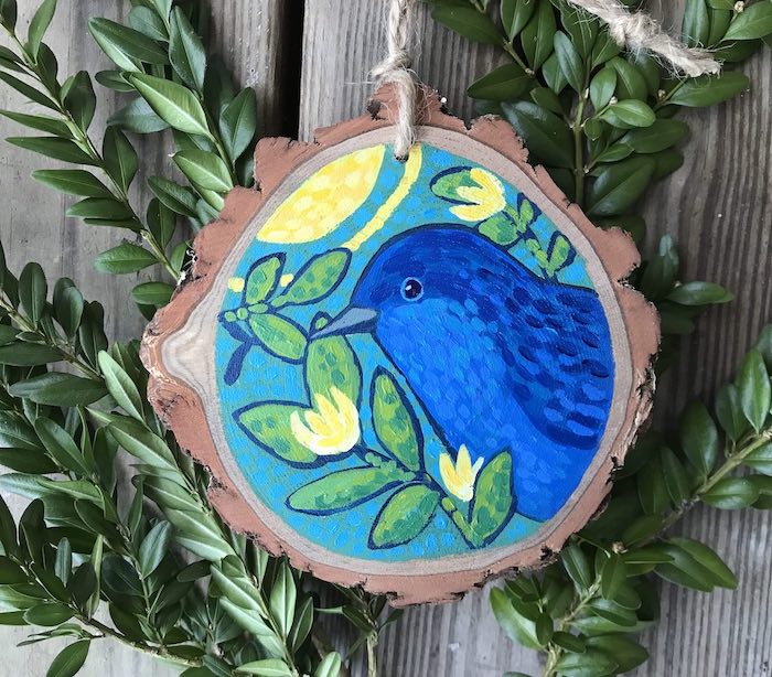 Last month, I had this itch to make some ornaments. I’d seen some that were made with wood slices and loved the way they looked. It looked like fun, a new challenge, and something that would ease me back into painting. (Full disclosure: I have two wood panels in my house that have been painted over at least four times. I had these ideas for paintings, and completely psyched myself out, and then shoved them under my work table, at the bottom of a pile, where they have languished for over a year. )