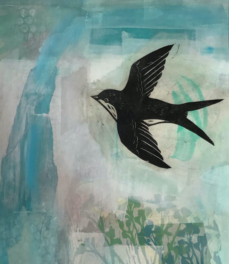Mixed media was way outside of my comfort zone: I’ve dabbled in it a little, and experimented with using monoprint techniques to make big colorful prints with details and textures that I can’t really achieve with my usual linocut or woodcut printing. But in the past, I haven’t had a lot of success with it. I had 10 days to make some new pieces for the show, so I got out my calendar and scheduled myself a few hours of work time each day. Then I watched some videos by Tom Quigley, an artist who does some really interesting work with mixed media. After watching, I had a head full of ideas I wanted to try, and was eager to layer those ideas with some printing techniques, too.