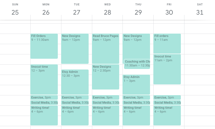 A friend of mine told me that I needed to create a Google calendar. “Make blocks of times you need for all of the things you want to get done in a week,” he said. “Then move those blocks around into a time frame that works.” It sounded simplistic when he said it, but I did it anyway. And you know what? It worked. My method had been too simple: I’d simply written down 2-3 things that I had to do each day: deadlines for clients, orders to fill, a new show to prep for. I hadn’t block out times in the day to do these things, but considered my days a success when I completed those tasks.