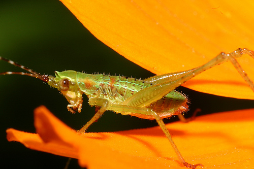 I was horrified at some point during each of these sessions, when some unidentified green insect chomped down on me. The first two times, I smacked it so hard that there was no hope of naming the species. On the third day, I took the mangled body inside for my roommate to identify with her pocket guide to carnivorous North American insects. She’d thought I was making this up, I think–a green biting insect in the yard? Surely not…